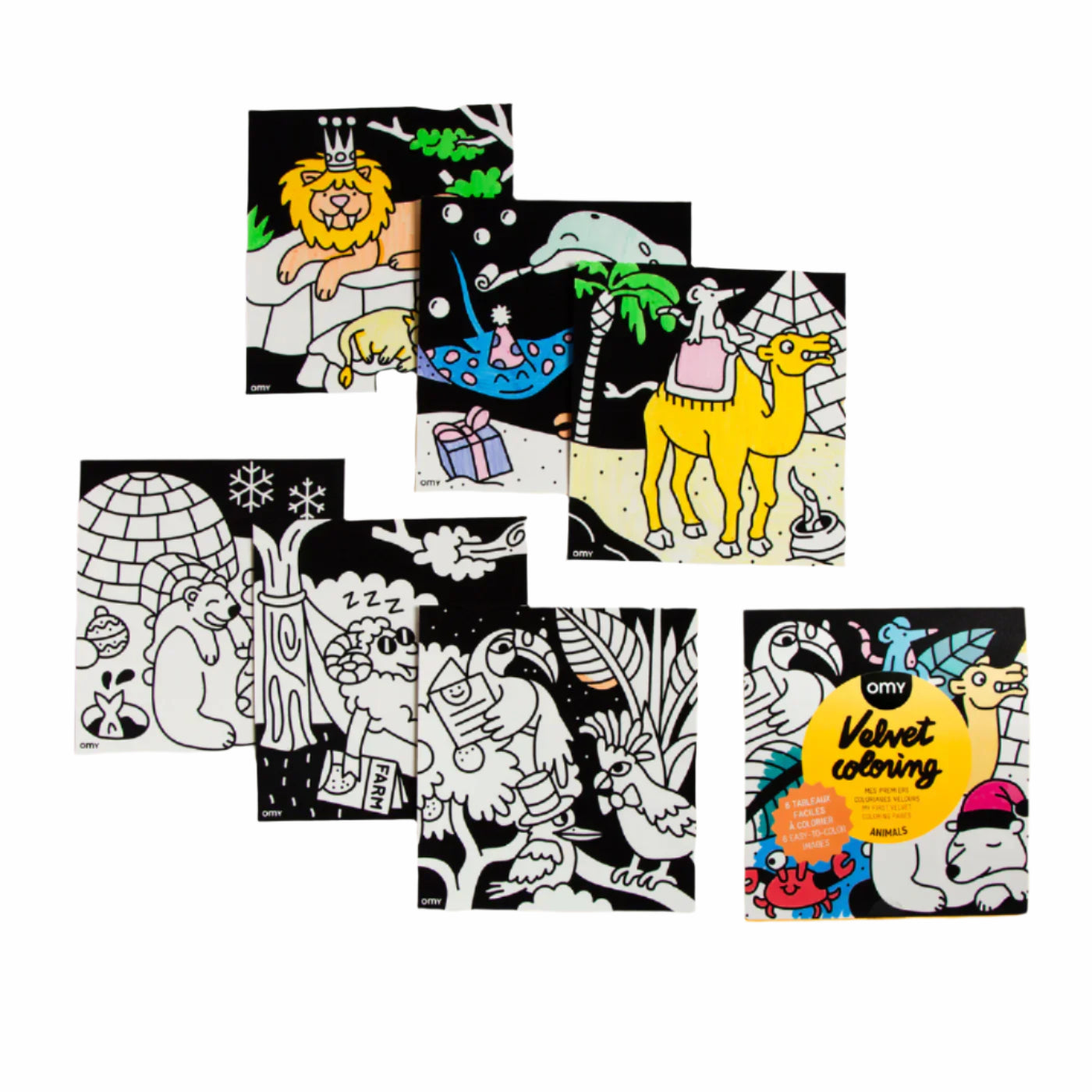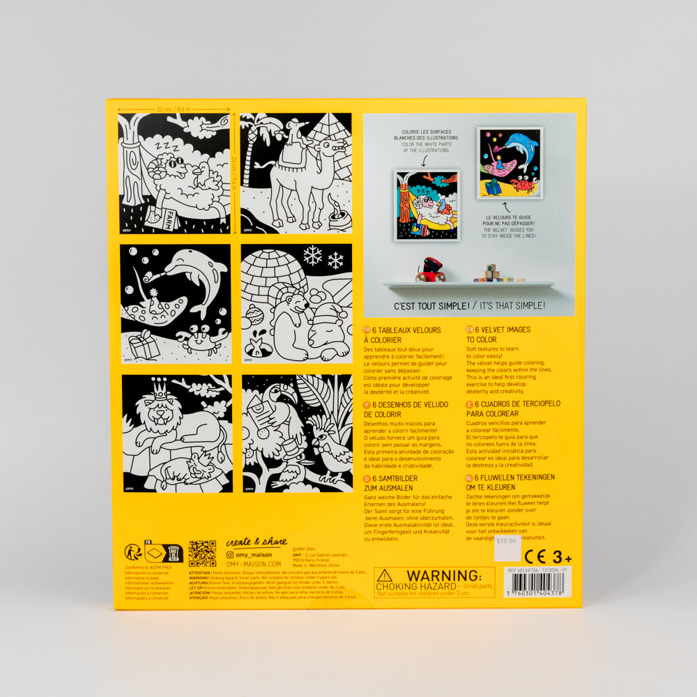 Tigers, bears, sea animals, and camels appear on these six velvet coloring sheets. Learn while having fun! These soft velvet coloring sheets help guide younger children to color without going over the lines. Perfect for developing dexterity and creativity. Recommended for ages 3+