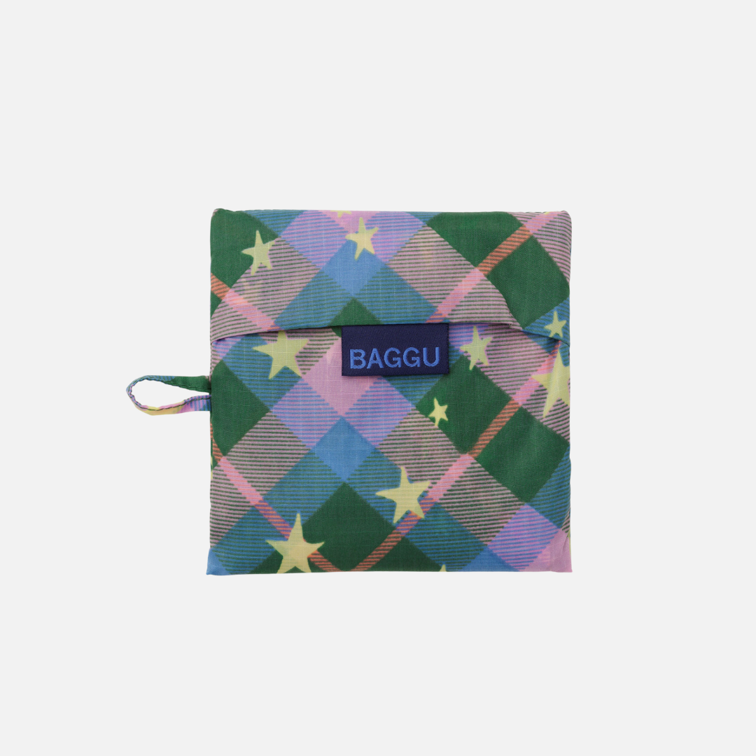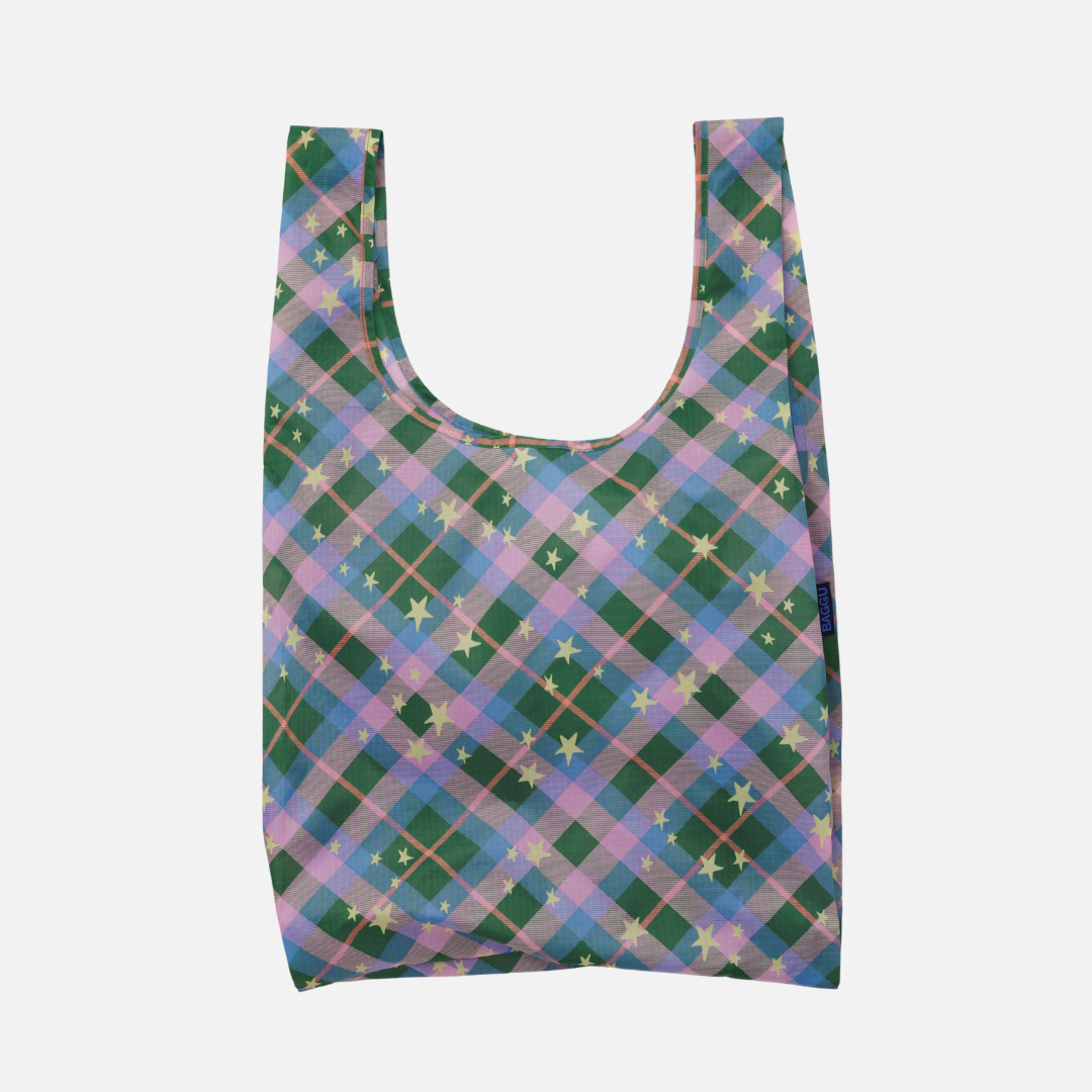 This ripstop nylon reusable bag is not just for the grocery store, it goes everywhere and hauls (practically) anything. Carry in your hand or over your shoulder. Holds 2–3 plastic grocery bags worth of stuff. Folds into a flat 5" × 5" pouch and holds 50 lbs. Made from 40% recycled nylon sourced from pre-consumer waste. Machine washable.