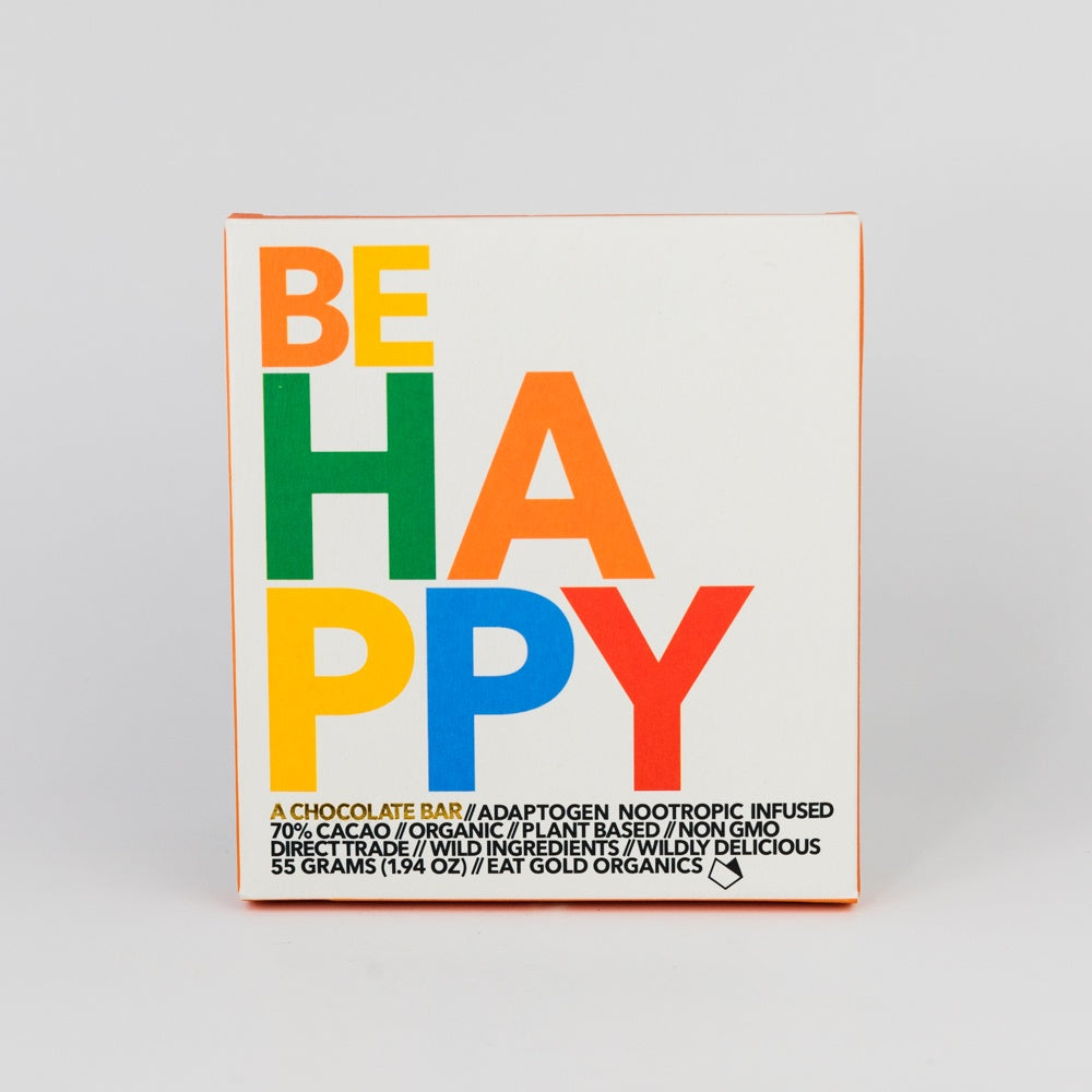 Be Happy is a potent, functional chocolate bar formulated to elevate your mood. Indulge in 4+ squares and enjoy being alive and live your life in full color. Chocolate makes you happy all on its own, but Eat Gold Organics has taken it one step further - with goji berries, adaptogen-rich ‘shrooms and tyrosine, Be Happy is a recipe for even stronger feel-good vibes. Dairy-free, gluten-free, grain-free, fair trade, non-GMO, no artifical sweeteners, no preservatives, organic, and vegan.