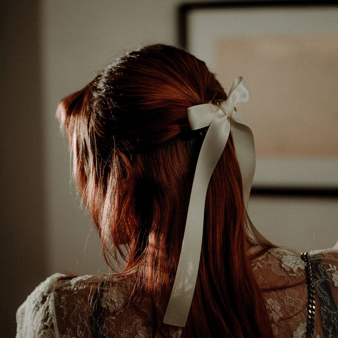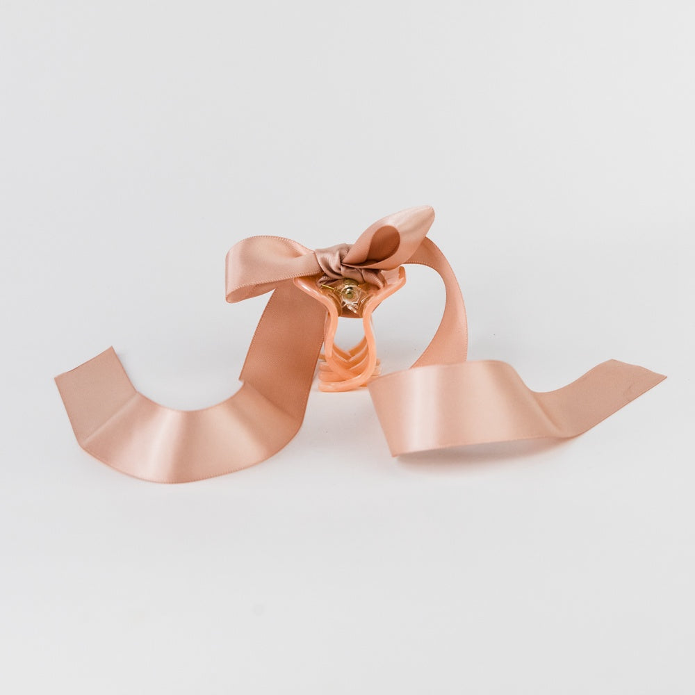 Simple and sweet. This Bow Mini Claw is an elevated spin on Hey Ricochet's standard mini claw shape, with fabric ribbon threaded through the clip to create an easy to wear bow that actually holds your hair up. The claw body is made from plant-based cellulose acetate. Due to the nature of the materials and process, each piece is unique and small variations will occur. Designed in Austin, Texas and responsibly made in China.