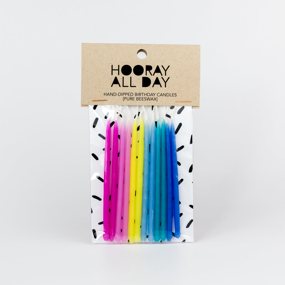 These birthday candles are hand-dipped and 100% beeswax (instead of paraffin) so they create the loveliest glow for pictures! Their burn time is 15-20 minutes, so you can use them multiple times. Each package comes with 12 birthday candles. Due to their handmade nature, colors may vary slightly from batch to batch.