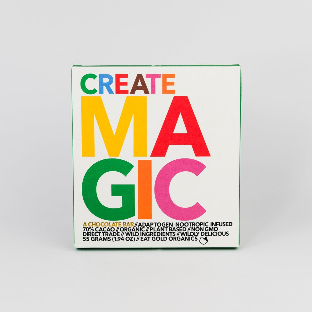 Create Magic is a potent, functional chocolate bar formulated to inspire creative flow and focus. Indulge in 4+ squares and create magic in work and play. Boost motivation and focus with functional micro-dosing. Create Magic is complete with matcha powder, citicoline, and adaptogenic lion’s mane. GET IT DONE. Connect to the portal of imagination. Dairy-free, gluten-free, grain-free, non-GMO, organic, and vegan.