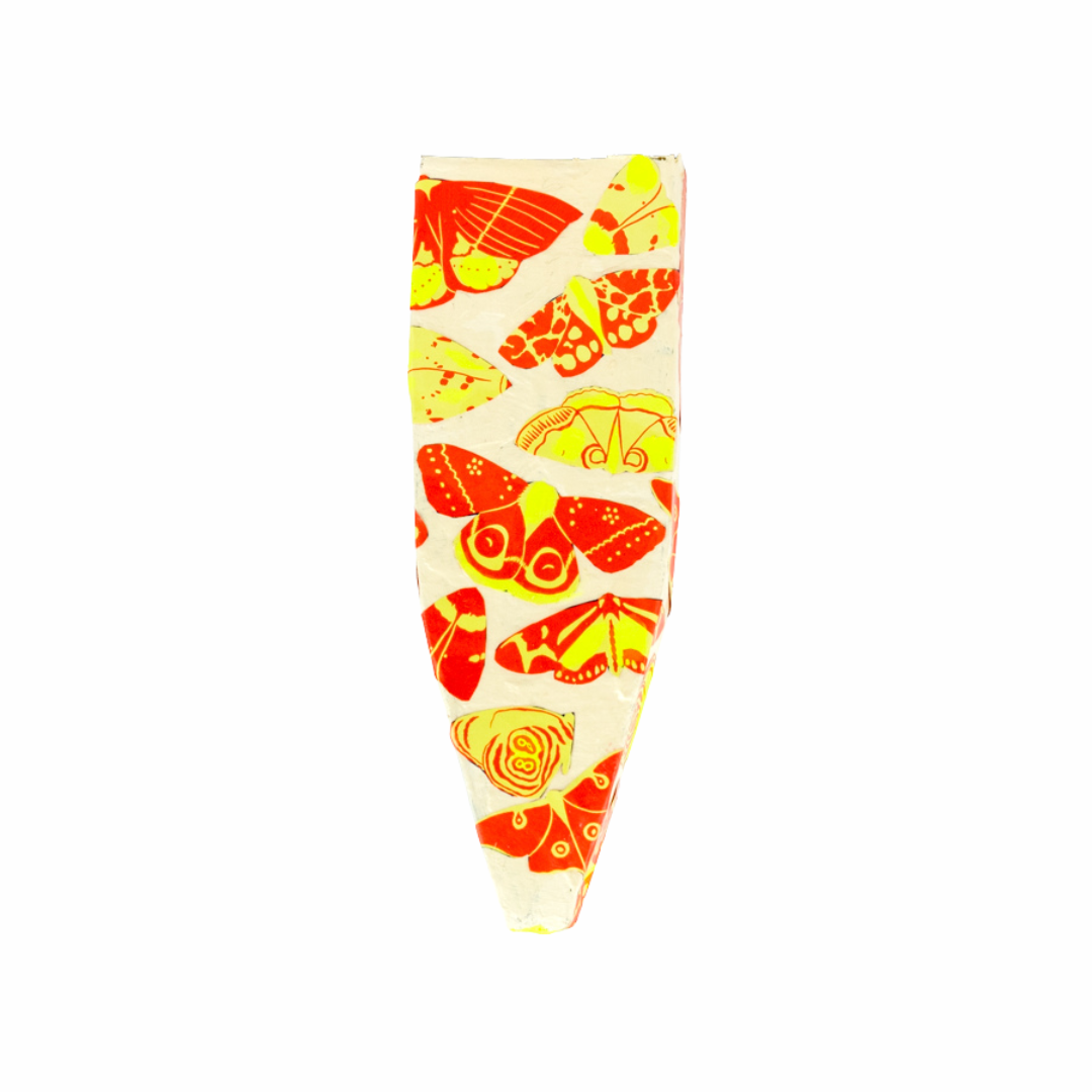 Hangable paper vase with moths and butterflies motif. Made of cardboard, kraft paper, bits of wrapping paper and paint.