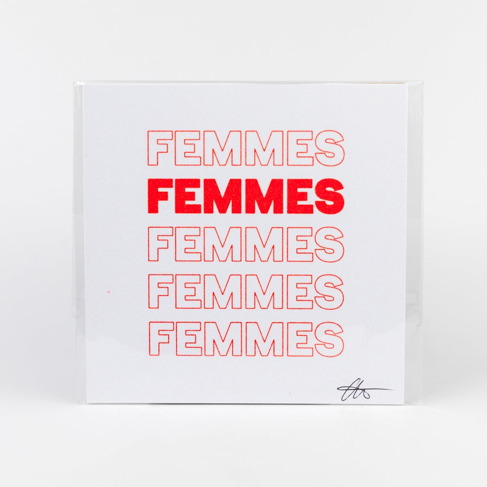 The Femmes Art Print takes visual cues from the iconic "Thank You" shopping bag, bold block letters in bright red, repeated for emphasis, and paired with a nostalgic, grainy texture that feels both familiar and fresh. The central “FEMMES” stands out in solid red, while the others are outlined, creating a dynamic rhythm that draws your eye in and keeps it moving. It’s a playful homage to femme identity and visibility, wrapped up in a pop-art inspired print that’s equal parts empowering and aesthetic. Signed and printed on 120# cover smooth uncoated, bright white paper in Chicago, IL.