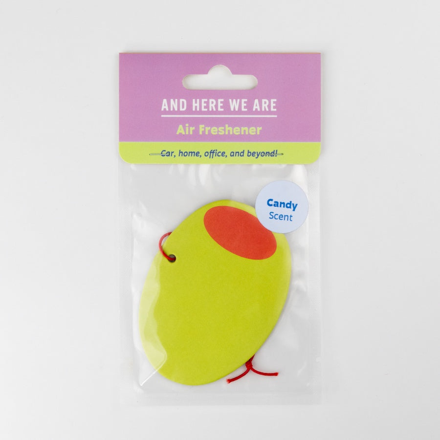 Your favorite new foodie air freshener! Hang this giant green martini olive anywhere that could use a dose of fun. Scented with an extra sweet fruity candy scent. Double sided printed on a thick and durable paper and scented with high quality essential oils, it's perfect for a quick refresh of your car, office, or home. Plus, they’re a cute ornament to keep around after the scent has faded. Designed and packaged in Columbus, OH, with artwork by Meghan Hopkins Sokorai.
