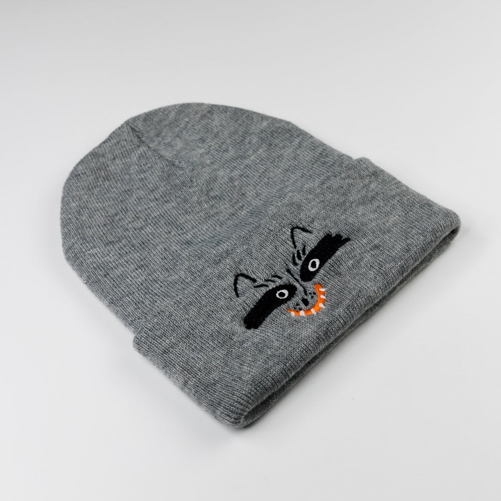 Stay warm with this 12” knit embroidered Raccoon Beanie! Perfect for anyone with a head ;) Designed and embroidered in San Jose, CA.