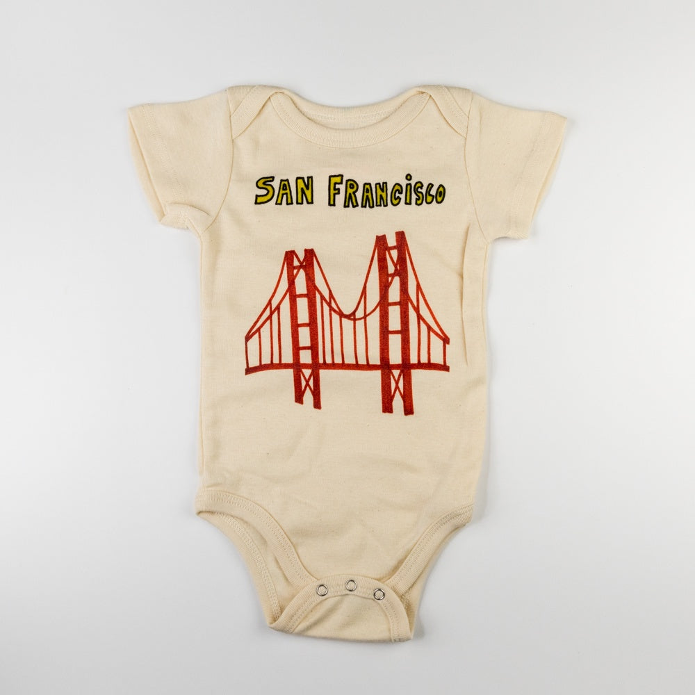 Rep the city by the bay with the iconic Golden Gate Bridge on this baby onesie. A perfect gift for little ones. 100% organic cotton. Designed in Venice, CA. Made in the USA.