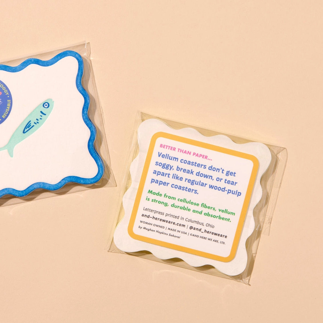 A fresh sardine catch for your coffee table or bar cart! This set of 4 vibrant, modern coasters is letterpress printed on durable and absorbent vellum. Vellum coasters won’t get soggy, break down or tear apart like wood-pulp paper coasters. Letterpress printed and die-cut in Columbus, OH, with artwork by Meghan Hopkins Sokorai.