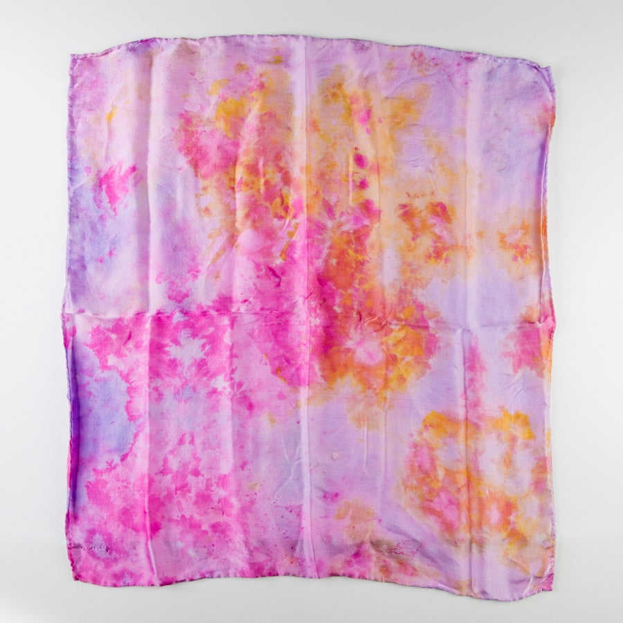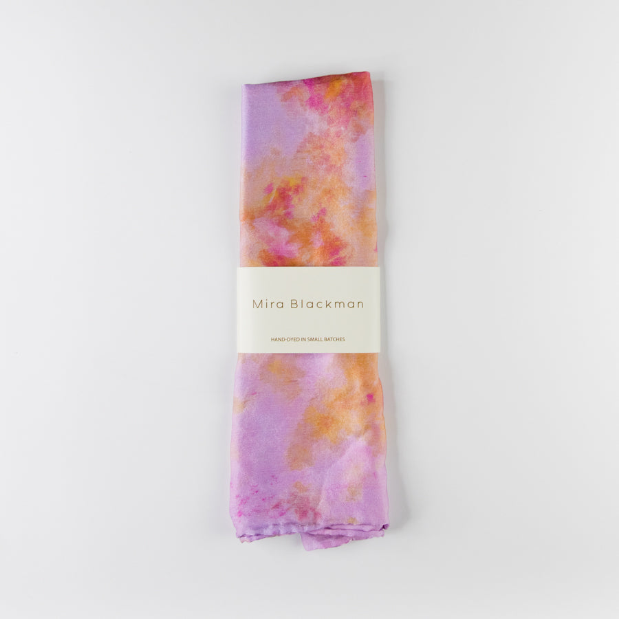 Have fun accessorizing with this beautiful and versatile hand-rolled hem silk scarf! This delicate scarf is dyed by hand in Mira Blackman's backyard studio. Every elementfrom the temperature that day to the way the wind is blowing affects the way it comes out. It's a truly magical and collaborative process. Due to the handmade nature of this item, exact colors and patterns will vary.