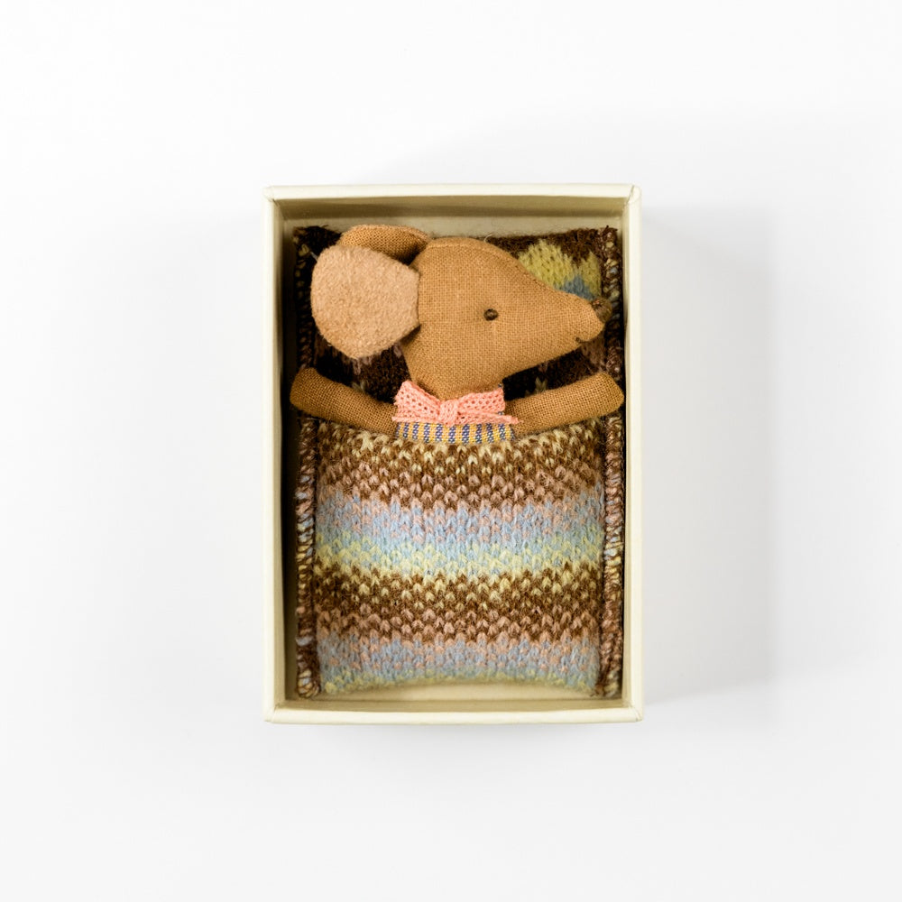 Meet your little one's new best friend. This mouse is ready for hours of play and sleeps tight in the little matchbox. The clothes and bedlinen are made of soft fabrics with unique prints and beautiful colors. Made from Oeko-Tex cotton filled with recycled polyester.