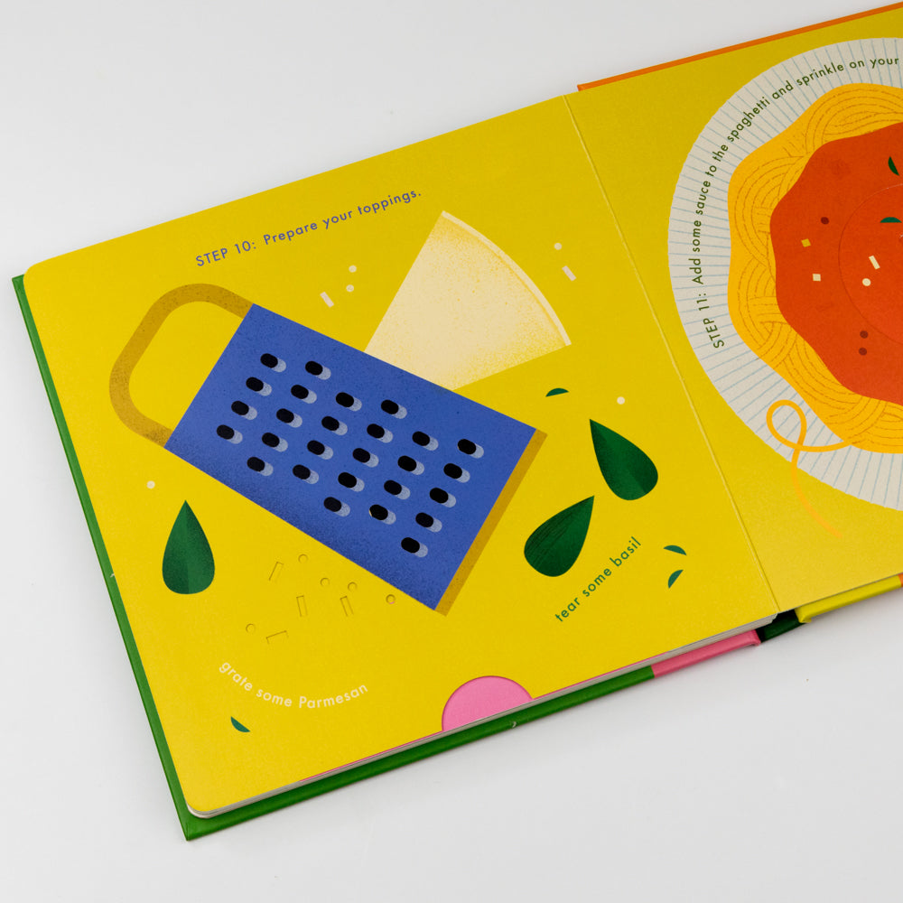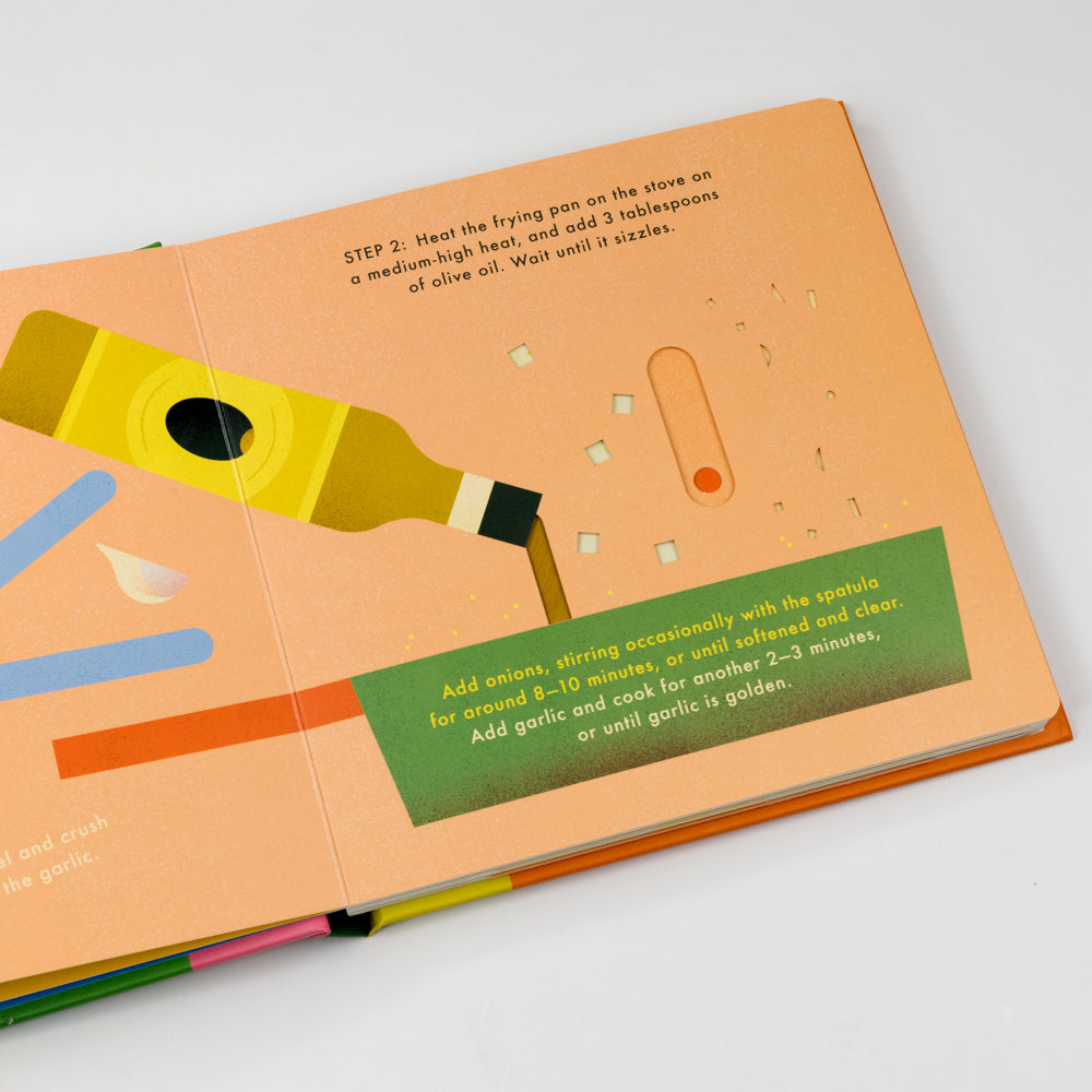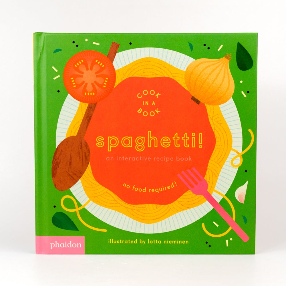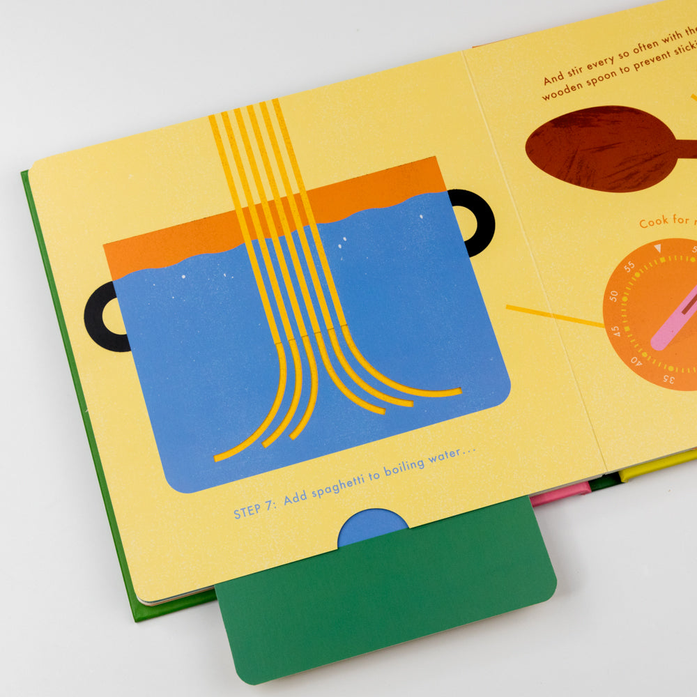 Cook pasta from scratch inside this interactive recipe book – fry, simmer, boil, drain, grate and more! Simple yet accurate recipe text takes you through the steps of cooking spaghetti, from chopping onions to serving up a plate of steaming hot pasta with tomato sauce, while the interactive novelty features invite you to participate in the process (without any spills)! Move the tab up and down to add the onions and garlic, lift the flap to open the can of tomatoes, pull the tab to bring the water to a boil, use the punch-out fork to twist some spaghetti onto your fork to taste, and more. One hundred percent adult-free, danger-free, and mess-free, cooking spaghetti has never been so independent! For ages 2-4. Board book, 16 pages.
