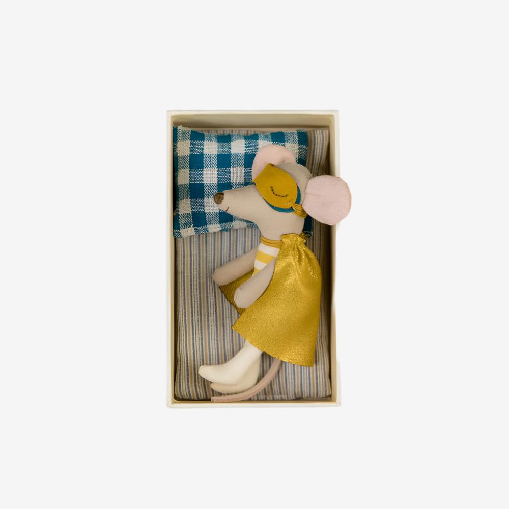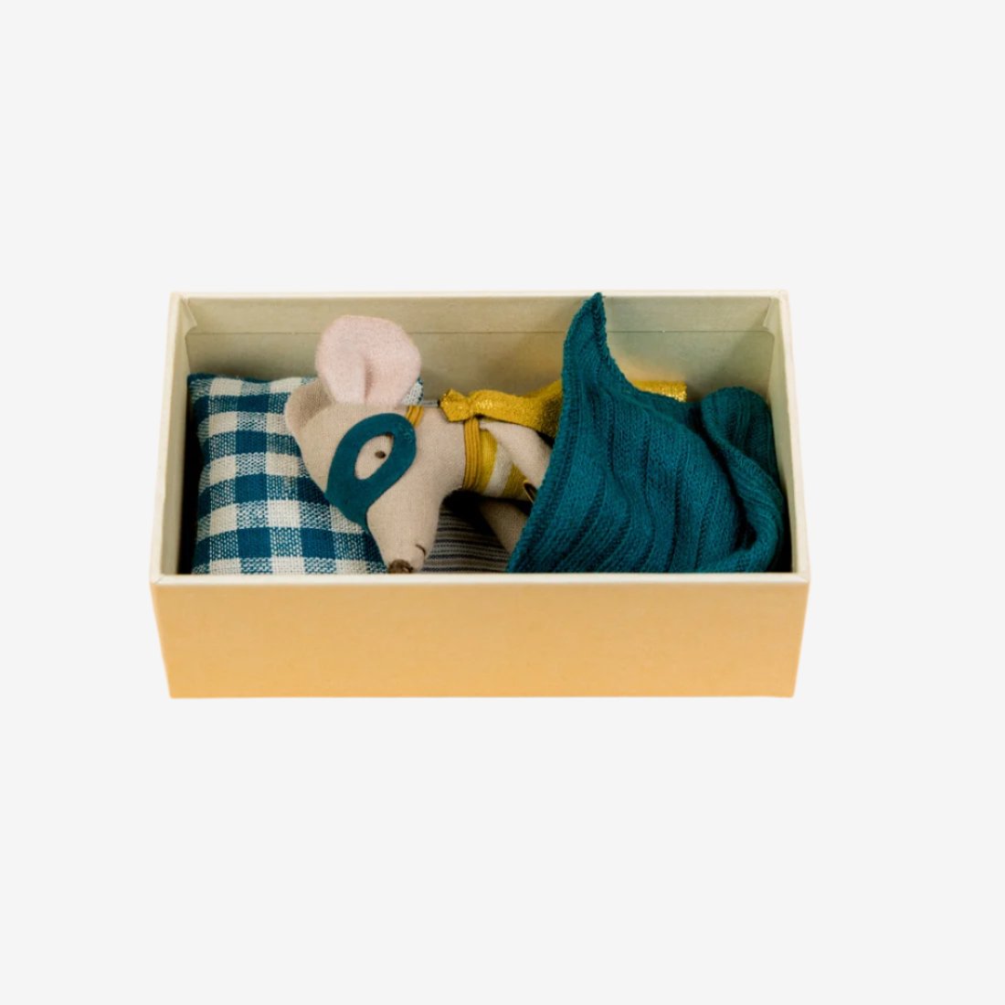 Meet your little one's new best friend! A classic Maileg item, this mouse is ready for hours of play and sleeps tight in a little matchbox. Includes two face masks - one for flying and one for sleeping. Made from Oeko-Tex cotton filled with recycled polyester.