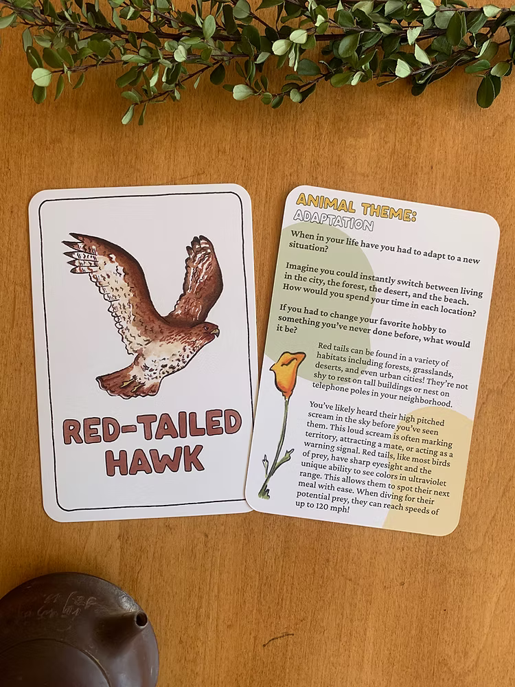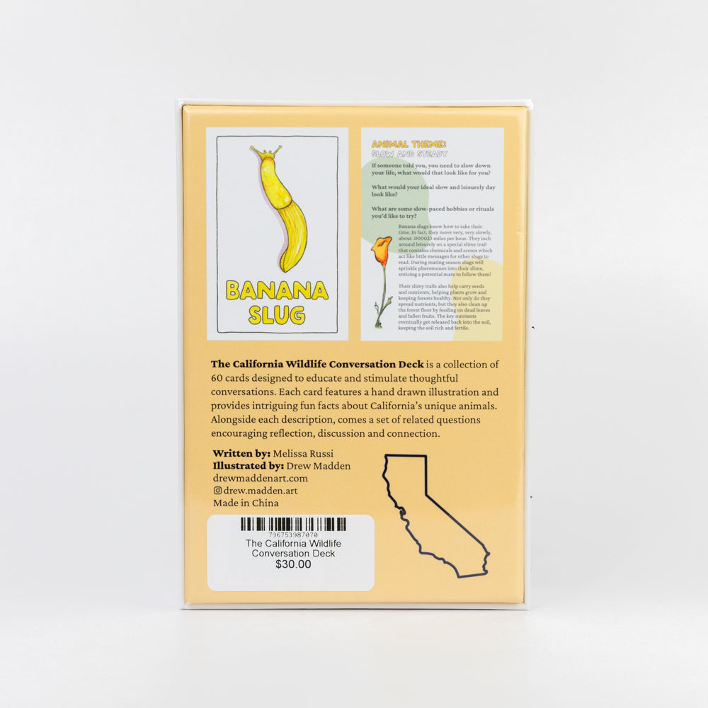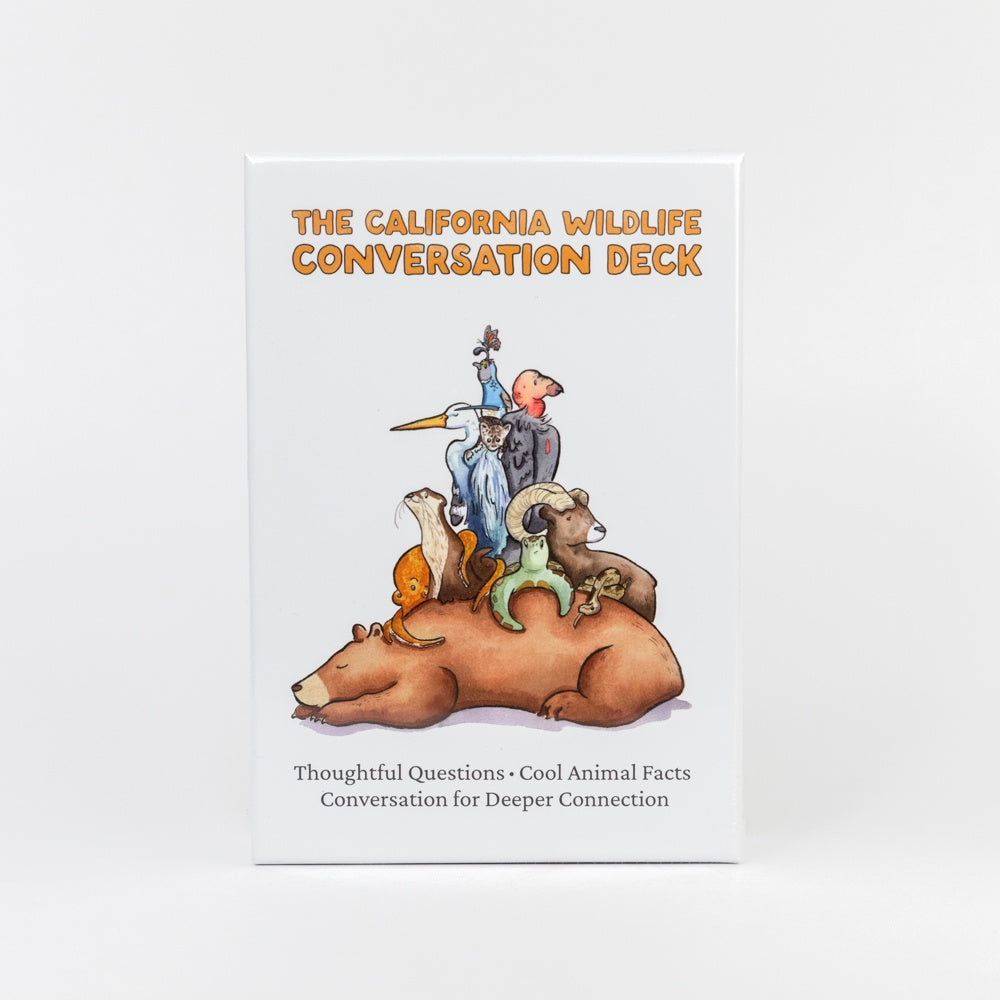 The California Wildlife Conversation Deck is a blend of art and education designed to foster meaningful connections and a curiosity for nature. Each deck features 60 beautifully illustrated cards, showcasing the diversity of wildlife found throughout the Golden State. From the hibernating black bear to the elusive mountain lion, each card brings a unique animal to life through vibrant hand-drawn watercolor illustrations. On the reverse side of each illustration, you will uncover a theme and some facts about the featured animal, alongside thought-provoking questions crafted to ignite meaningful conversations and reflections.