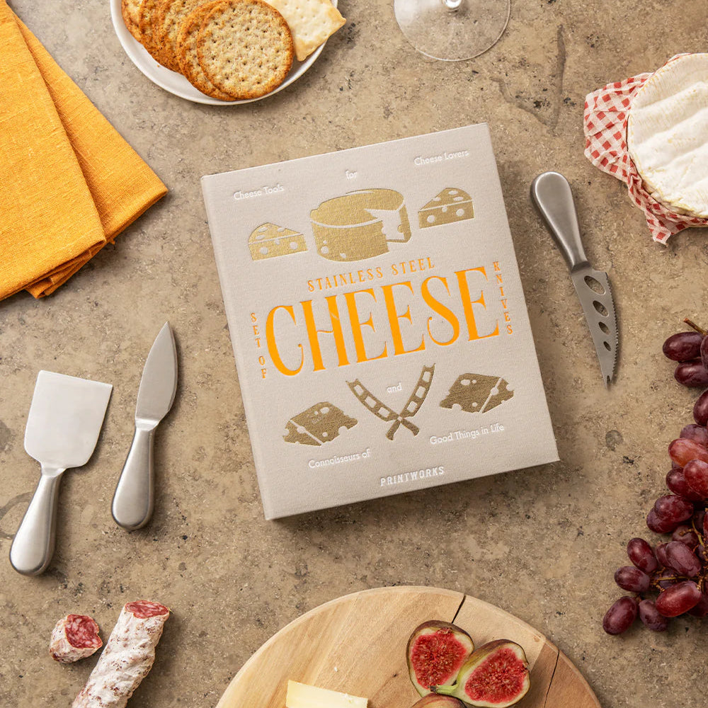 Introducing the essential kit for your cheese board - a refined toolbox in an elegant book-like box that makes the perfect going-away gift. Inside, you'll find three knives suitable for your favorite cheese varieties. From soft Brie to crumbly Blue Cheese and robust Parmesan, this kit has you covered. All products are made of stainless steel and are dishwasher safe. Includes one pronged knife, one chisel knife, one heart knife, and a guide for assembling your perfect cheese platter.
