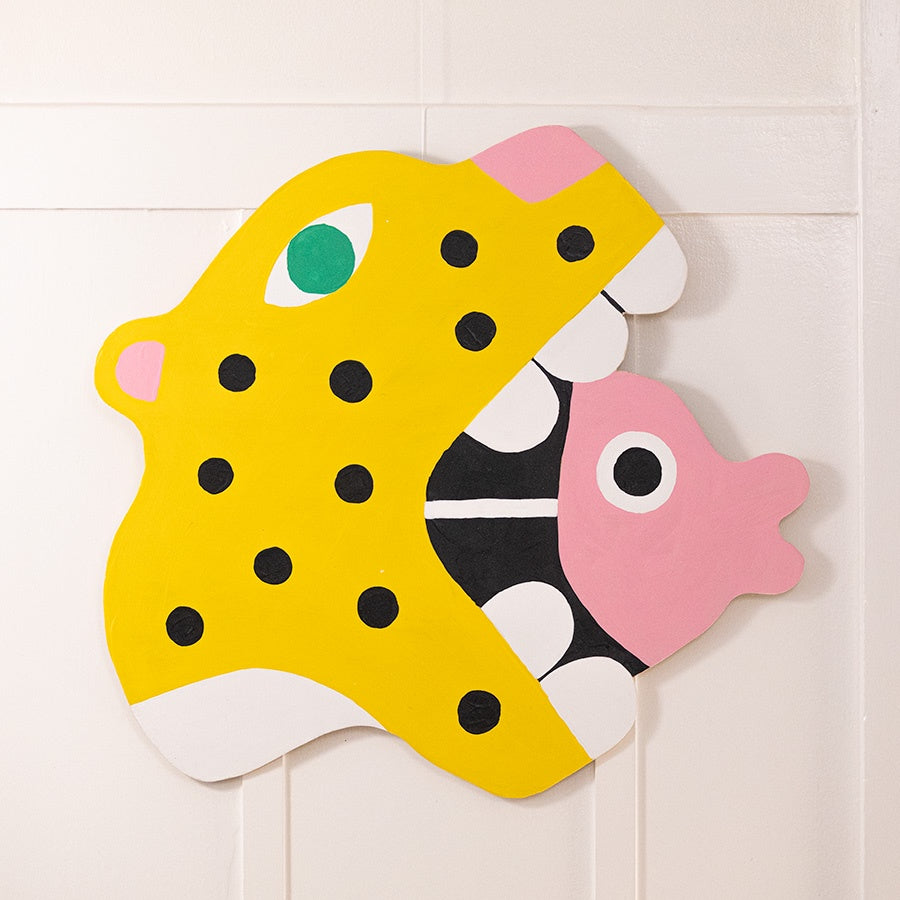 An illustration of a cheetah eating a fish. Painting on plywood.