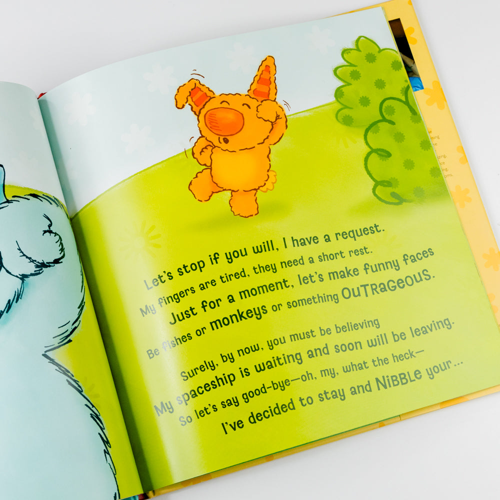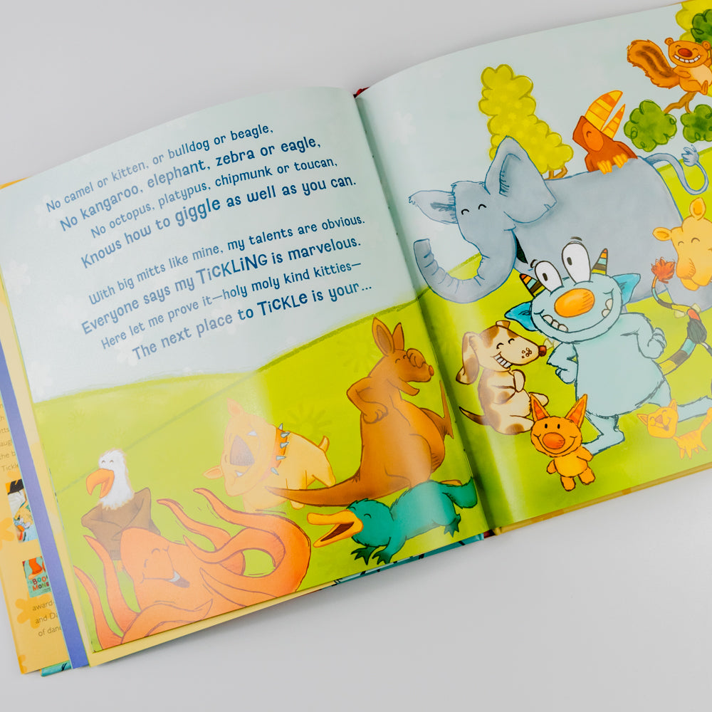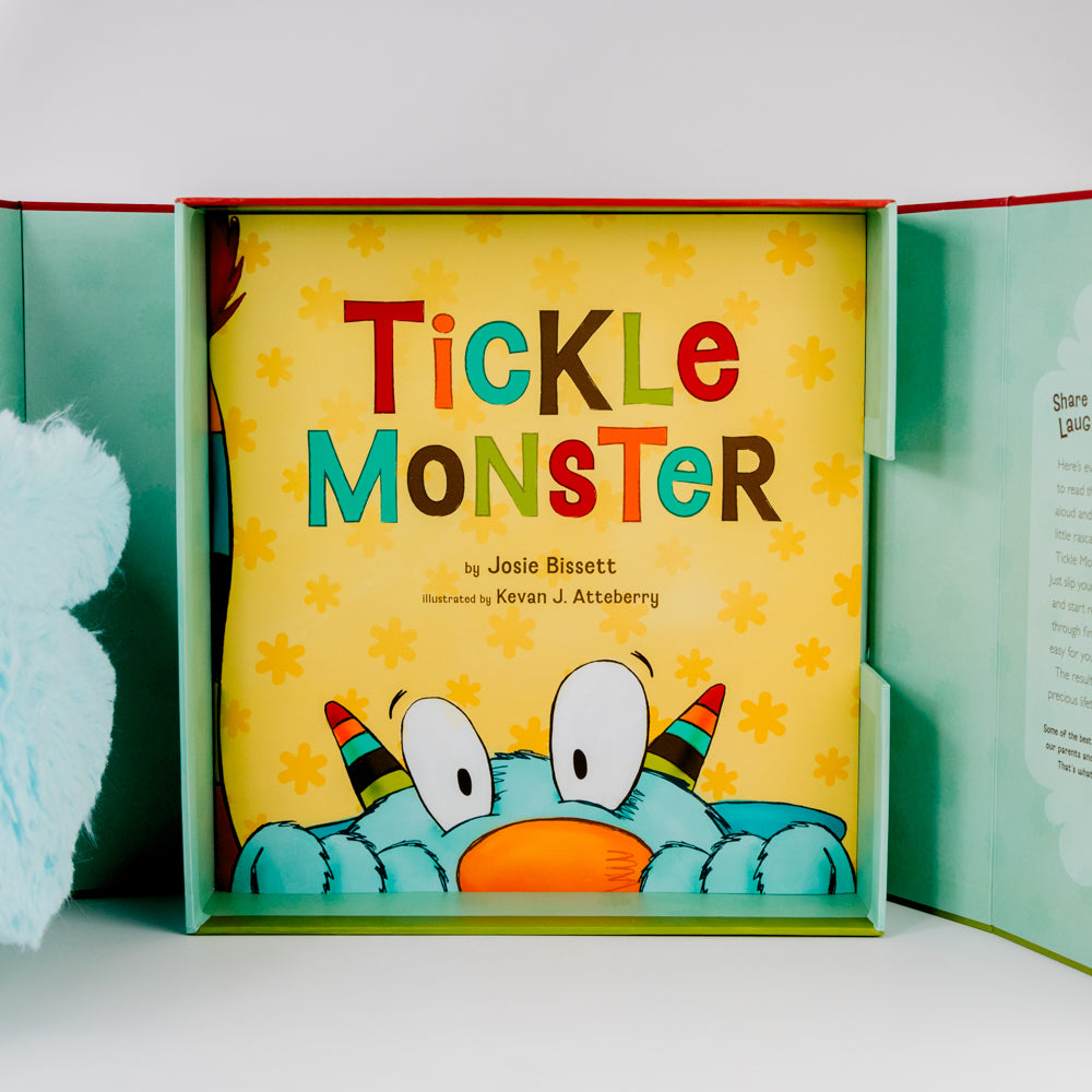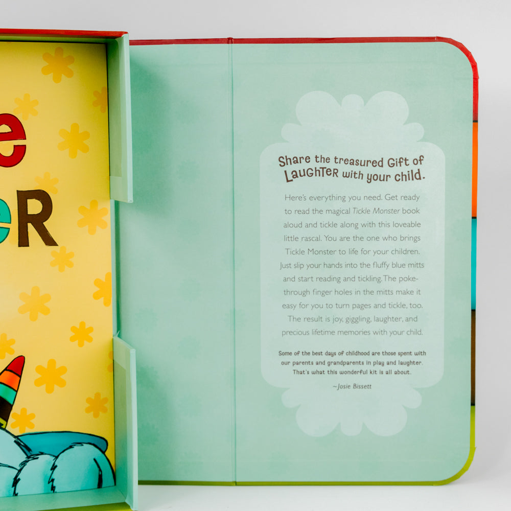 Here's everything you need to bring loveable Tickle Monster to life for your kids with the Tickle Monster Laughter Kit. Just slip your hands into the super-soft fluffy blue mitts and start reading and tickling. Finger holes in the mitts make it easy for you to turn pages and tickle, too. The result is joy, laughter and lifetime memories for your child. The Tickle Monster Laughter Kit comes in a colorful reusable gift box, and makes a wonderful gift for parents, grandparents and children - for any occasion. Tickle Monster is written by Josie Bissett and illustrated by Kevan J. Atteberry.