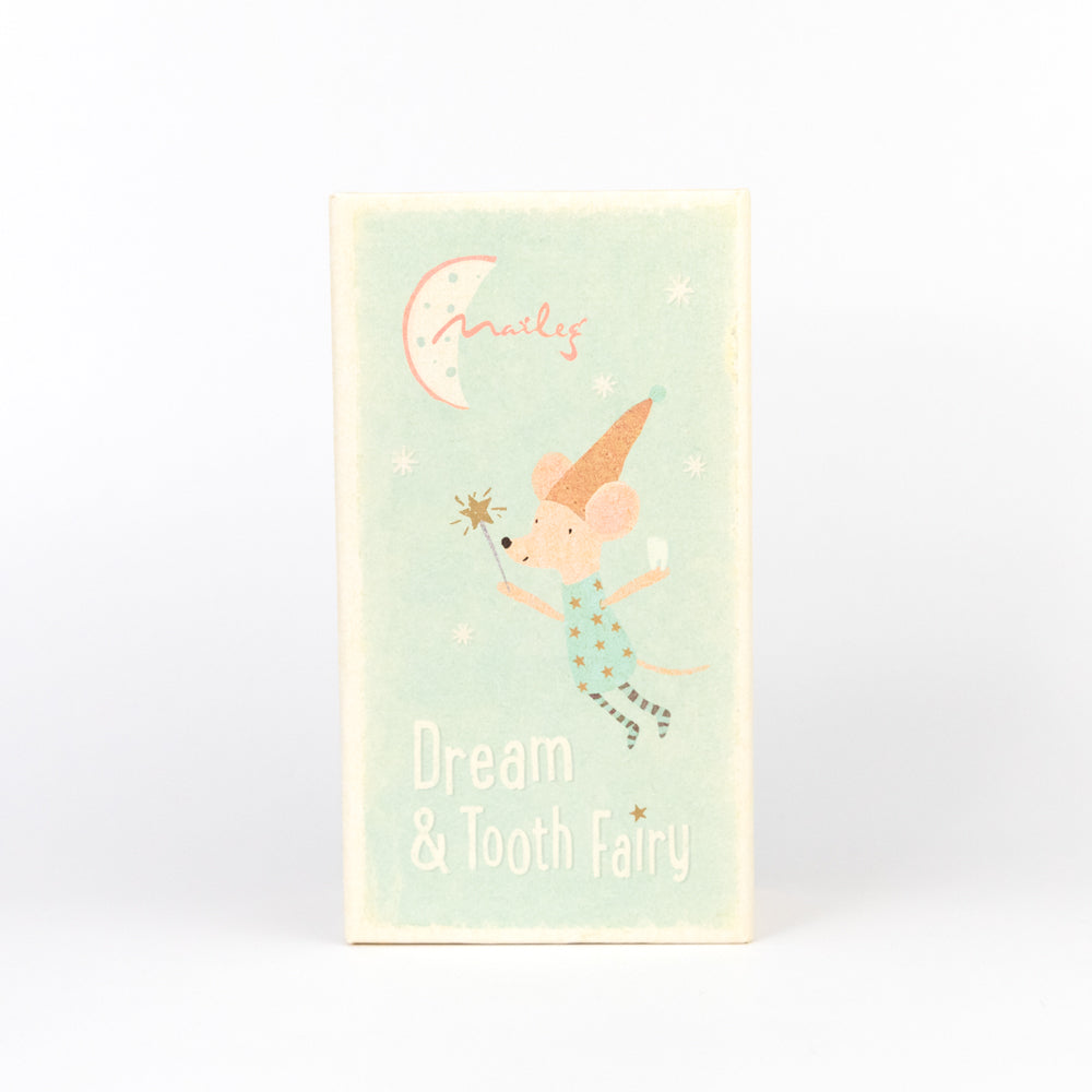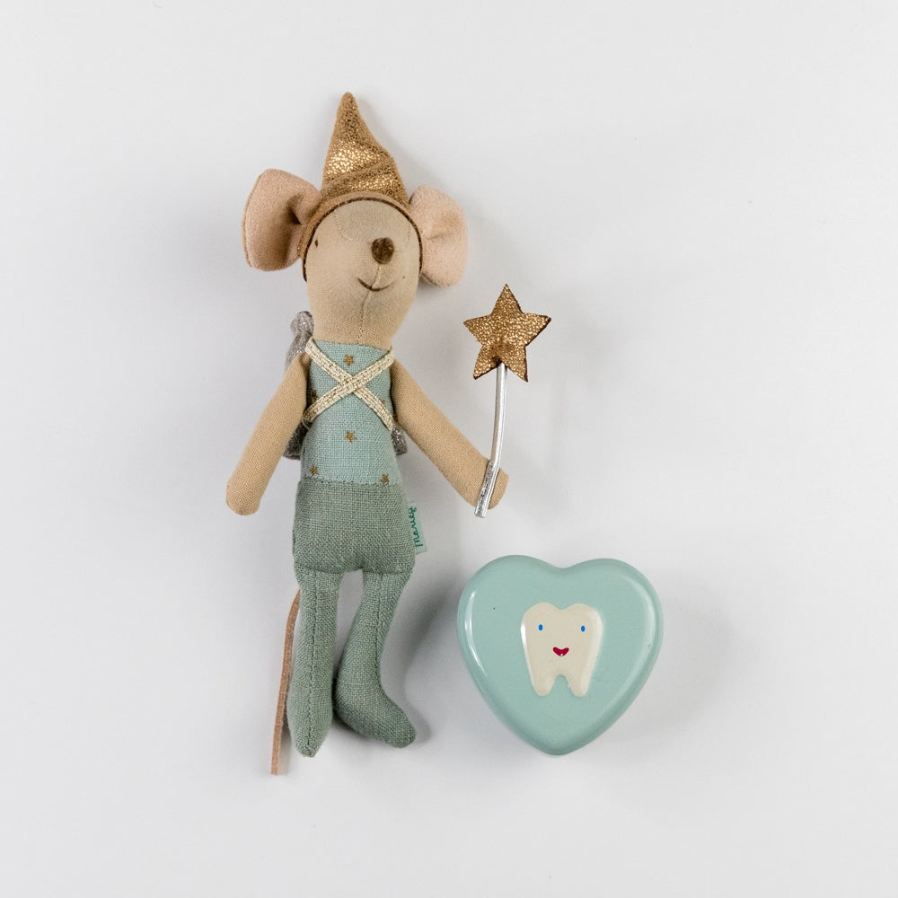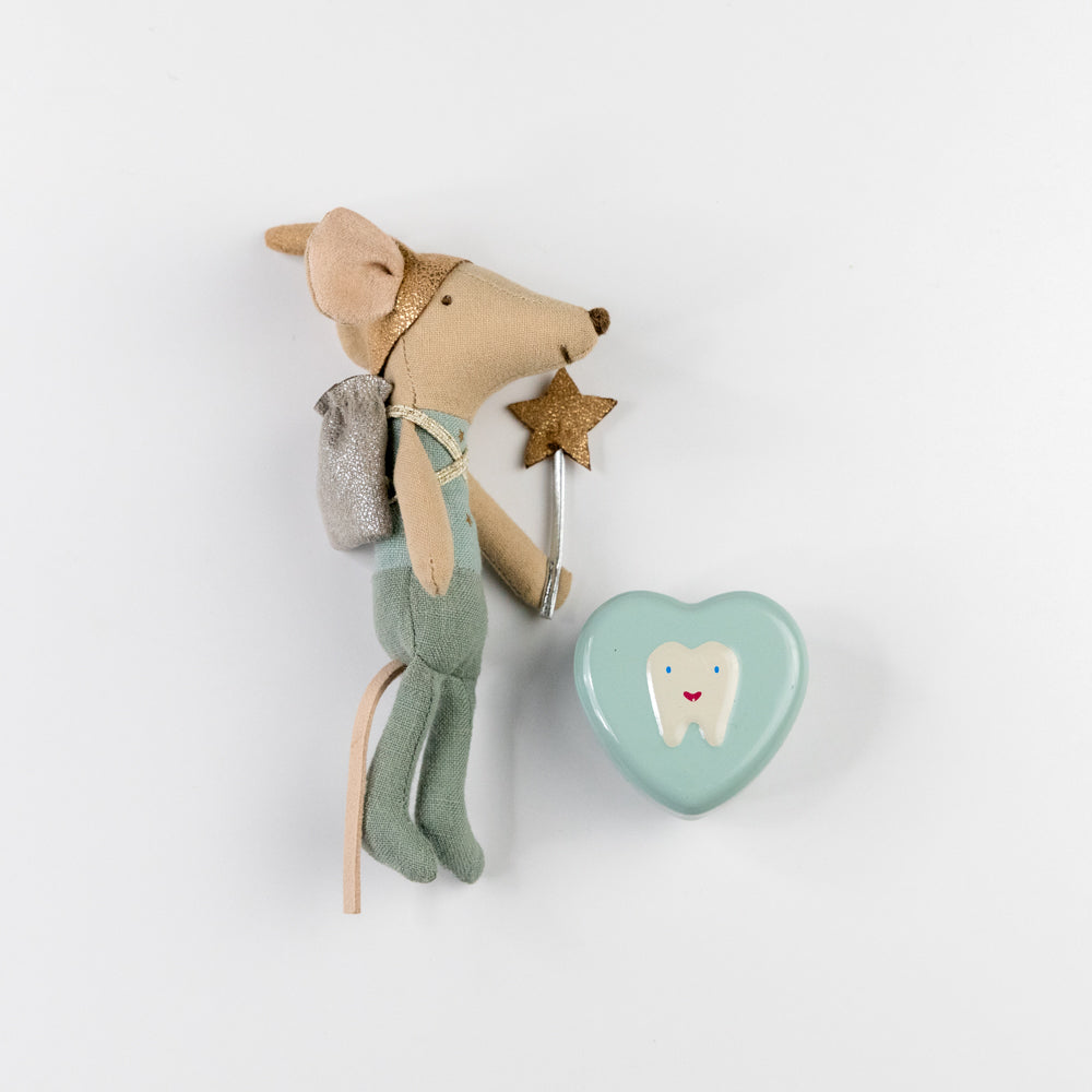 At night the tooth fairy spreads fairy dust, collects teeth, brings treats, and makes sure you have sweet dreams. Dressed magically in soft tones and with a shiny hat and a sparkly backpack, this mouse is ready for hours of play and sleeps tight in its own matchbox. Also comes with a tooth box to store your offering for the tooth fairy! Made from Oeko-Tex cotton filled with recycled polyester. Ages 3+