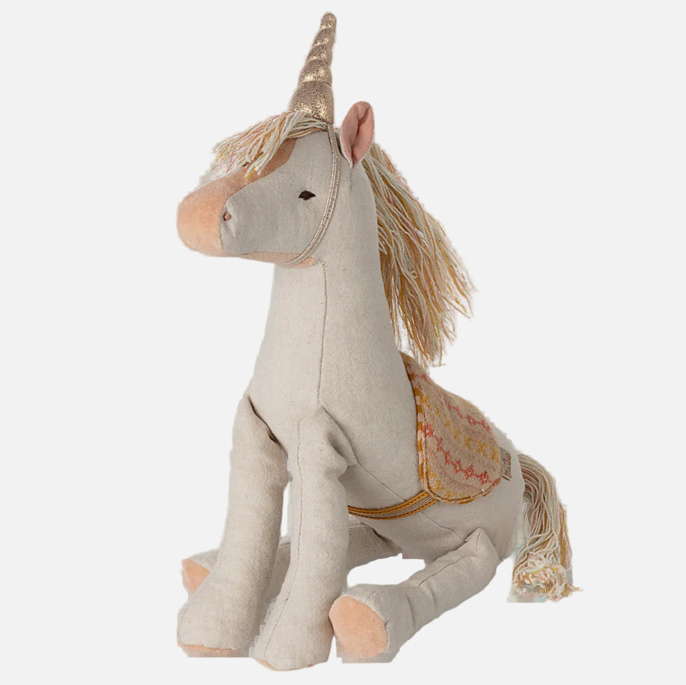 This unicorn is a peaceful companion, with a golden horn and a gentle expression that invites the imagination to wander. With a woven saddle, it's ready to carry little friends on storybook journeys. From royal processions to cosy bedtime tales, this magical friend brings wonder to every moment, inviting children and collectors alike into a world full of magic and possibility. Made of a soft blend of linen and cotton.